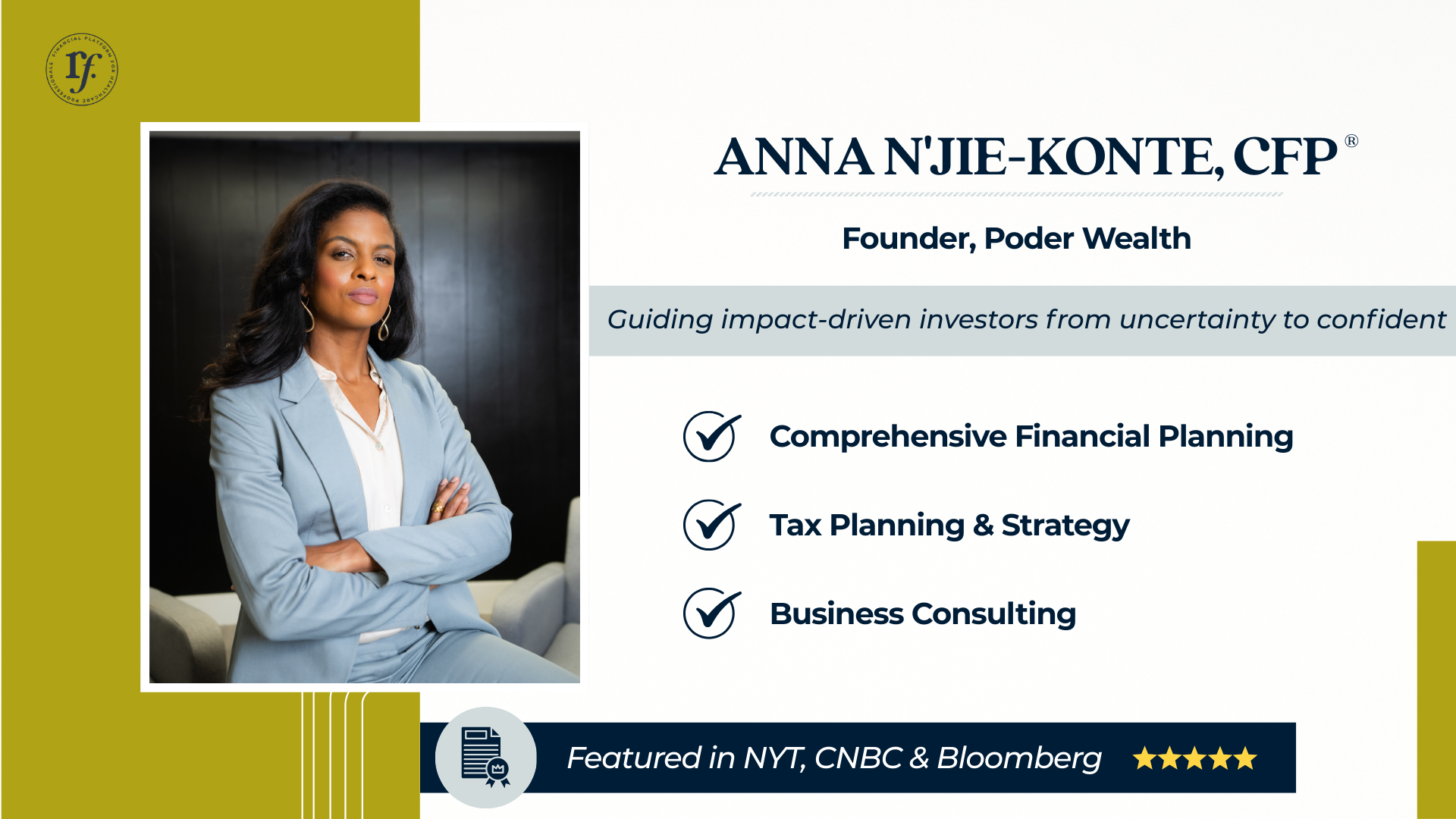 Anna N’Jie-Konte is the founder of Poder Wealth, a forward-thinking wealth management firm dedicated to helping high-achieving women and people of color build generational wealth.