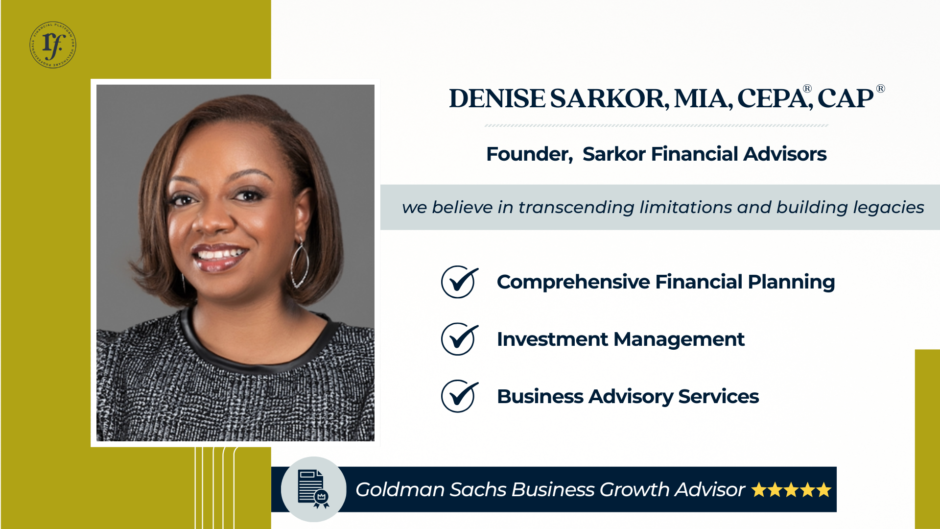 I’m Denise Sarkor, Principal & Private Wealth Advisor at Sarkor Financial Advisors, a fee-only financial planning and investment management firm.